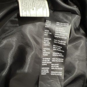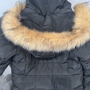 Full length zipper-closure, additional warm thin faux fur back to waistline soft lining, 2 zippered pockets, stand collar, attached hood with detachable faux fur trim, knitted cuffs and collar additions.