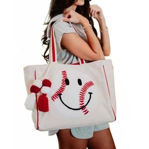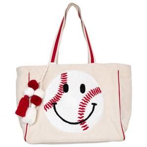 Elevate your accessory collection with the Baseball Oversized Happy Face Canvas Tote Bag by Katydid. Crafted from durable cotton, this beige canvas tote is perfect for game days, beach trips, or everyday errands. Measuring 16" x 13" x 5.5", it features a snap closure, a playful baseball patch, a tassel on the strap, and multiple inner pockets for organization. Choose this tote to bring a lively touch to your daily adventures.