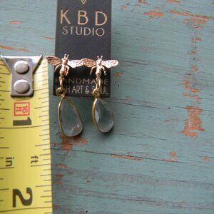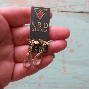 NEW KBD STUDIO ARTISAN HANDMADE HONEYBEE INSECT FACETED CRYSTAL DROP EARRINGS. GORGEOUS I BELIEVE HONEYBEE FAUX GOLD WITH A FACETED DROP FAUX CRYSTAL STONE.