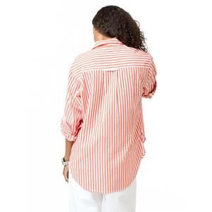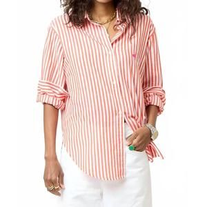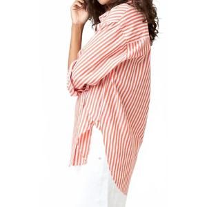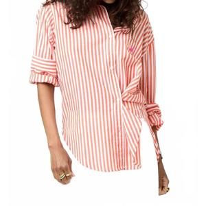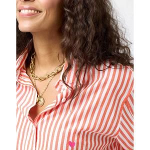 Introducing the KERRI ROSENTHAL Jack Stripe Shirt in a vibrant Aperol Orange, perfect for your spring wardrobe. This long sleeve button-down features a modern design with a higher shirttail hem, crafted from 100% cotton for exceptional softness and comfort. It measures 30" from shoulder seam to hem and is imported with a timeless, relaxed fit. Care for this stylish piece with ease by machine washing it cold and laying flat to dry. Frances is 5'9" and wearing a size small, adding a touch of playful elegance with contrast heart embroidery on the left chest.