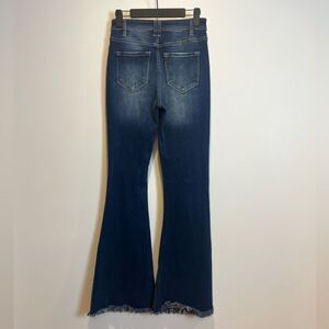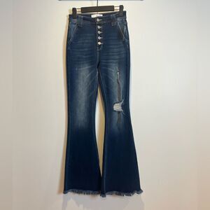 NEW KanCan Sian Exposed Button Fly High Rise Distressed Raw Fringe Hem Flare Leg Stretch Jeans. Smoke free; New Buckle tag attached.
