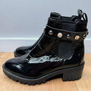 NEW Karl Lagerfeld Black Shiny Leather Porshay Lug Sole Studded Bootie Boot