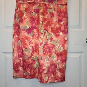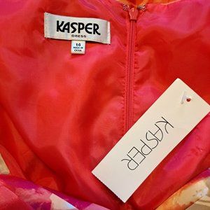 Brand new dress from Kasper. Perfect for a wedding guest or other formal occasion. Various pinks and tans, midi length, V neckline and cap sleeves. Overall lightweight. Size 14; measures about 20 inches between the pits, 16.5 inches across the waist and 40 inches long from shoulder to hem.