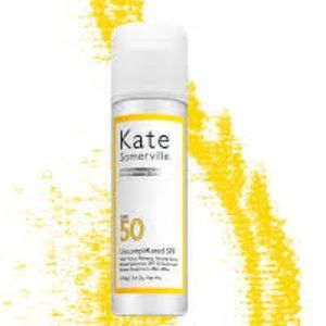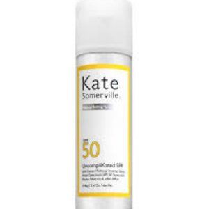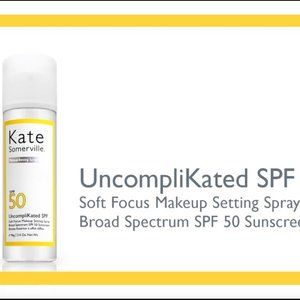 Kate Somerville UncompliKated SPF Soft Focus Makeup Setting Spray Broad Spectrum SPF 50 Sunscreen is a no-fuss fine-misting SPF 50 face sunscreen that instantly sets makeup, reduces shine, and provides a matte finish for a soft focus effect.
