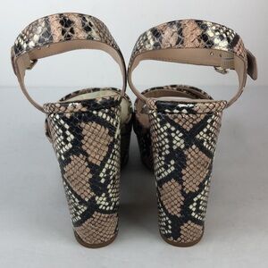 New with box. These cute heels are perfect for spring and summer! They have a gorgeous snake print, a chunky block heel, an ankle strap, a buckle closure, an open toe, a criss cross strap, gold toned hardware, the footbed is lightly cushioned for added comfort and they’re made of leather. Smoke free home. The box has wear.