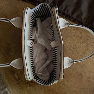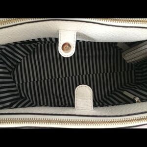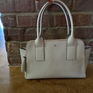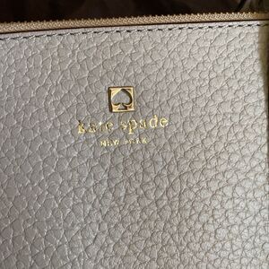 New with tags Kate Spade Southport Avenue Lydia clocktower pebbled leather handbag. Large top handle tote bag in soft grey pebbled leather. Kate Spade gold foil signture logo w spade on front, Triple entry top. Front & back zip compartments, Center w magnetic closure, Signature striped lining with interior zip and double slide pocket. Approximately 9.5" h x 12.5" w x 6" d, with Handle drop- 8.5". See pictures for details.