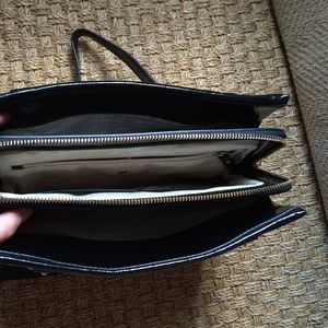 Beautiful black and cream striped purse. 3 section inside, middle section has 3 interior pockets and zipper close. Comes with Kate Spade duster bag.