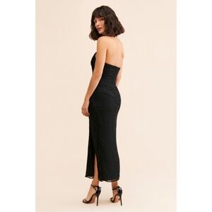 - Strapless, V neck, hidden back zipper with hook and eye closure, side slit, lined, embroidered dot pattern, cups with boned bodice, front twist knot detail
