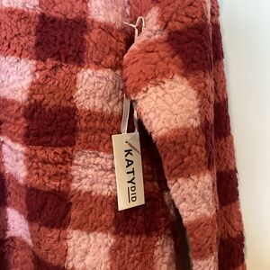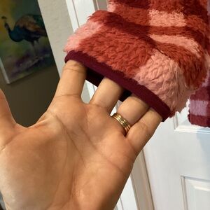 Soft fleece pullover with vibrant red and pink hues. Features a cozy design. Half zipper. Side pockets. Small cuff at sleeve. Light weight. So soft!