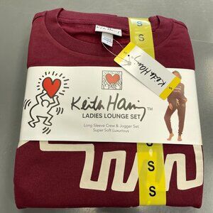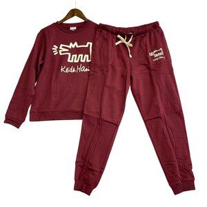 NEW Keith Haring Women's S Lounge Set Long Sleeve Crew Jogger Burgundy