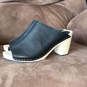 These shoes are made by Kelsi Dagger. They are a black leather open toe clog/mule style shoe with a wooden sole. Size 8 and NWOT/NWOB. Smoke and pet free home.