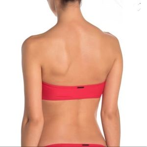 A classic beach-ready bikini top features a bandeau style and a bright sexy red.