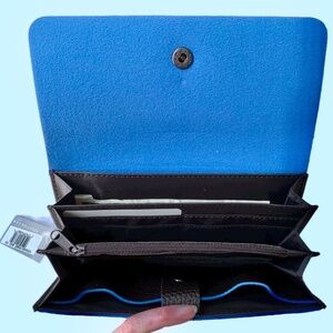 NWT! Black faux leather wallet with rich blue and black interior and the best part is it has lots of compartments. And if you stuff your wallet like I do it has two snaps on the inside so if you really fill it there's a second looser snap so you can still close it without straining or pulling it out of shape. Classic and minimalist. The only embellishment is the Scandinavian pewter look snap cover on the front and the blue from the interior showing around the edges. Also, since it's brand new with tags it would make a great gift...um, that is if you can part with it.