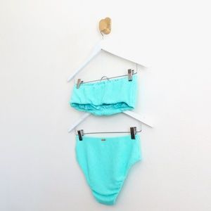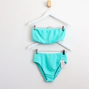 "Stunning aquatic aqua in a stretchy Italian luxe crinkle fabric, The Aruba Bandeau Top isn't just all-day-wearable, it's the perfect shade of on-the-shore island blue and there’s nothing comparable. This textured swimsuit is ideal for spring breaks, island escapes, and will make you wish the sun never sets"