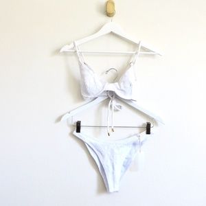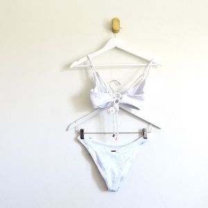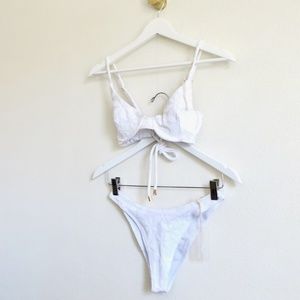 Whether you're sailing the Greek Isles on your honeymoon, or sippin’ champagne in a cabana at your Miami bachelorette party, this is the show-stopping white bride-to-be bikini you need."