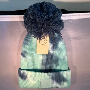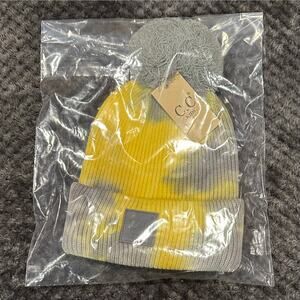 NEW! Kid’s Teal Blue or Yellow Gray Tie Dye Pom Pom Ribbed Beanie (K0082)