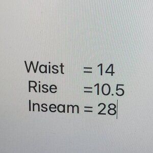 • Waist = 14 inches, Rise = 10.5 inches, Inseam = 28 inches