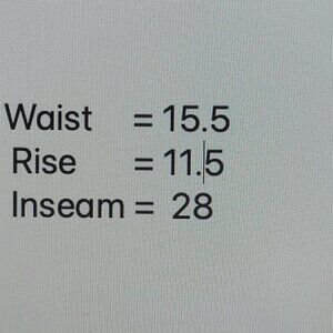 Waist = 15.5 inches, Rise = 11.5 inches, Inseam = 28 inches. No visible flaws detected.