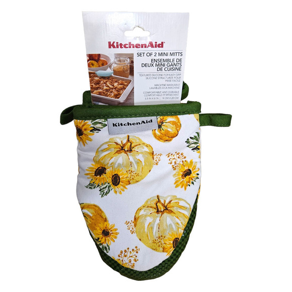 NEW KitchenAid Mini Oven Mitts in Fall Harvest Sunflower & Pumpkins in White, Green, Yellow Colors (Set of 2)