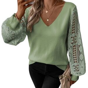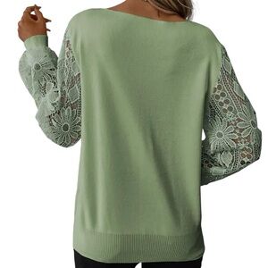 New! Lace Splicing V Neck Knit Sweater, Elegant Long Sleeve Loose Sweater. Fits bigger- open lace sleeves