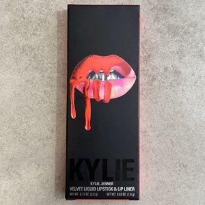 Brand NEW in box, never been used or swatched full size Kylie Jenner Cosmetics Velvet Liquid Lipstick & Lip Liner Kit in the shade Party Girl (bright hot coral).