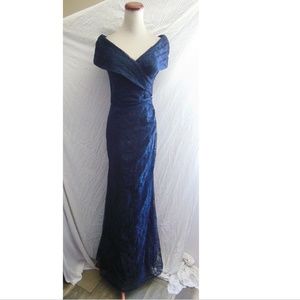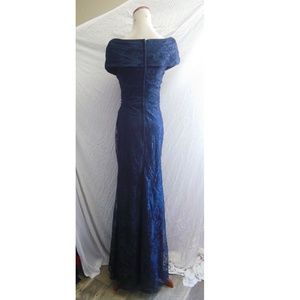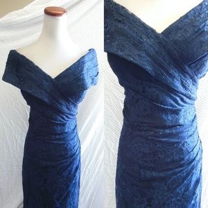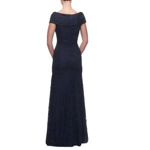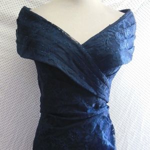 NEW LA FEMME Navy PORTRAIT NECK Ruched Waist SPARKLE LACE Trumpet EVENING GOWN 8