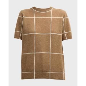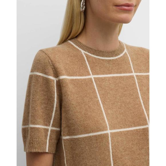 NEW LAFAYETTE 148 cashmere grid intarsia short-sleeve pullover in camel multi