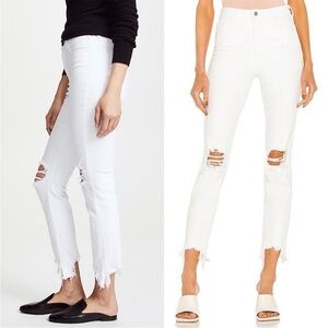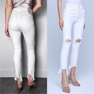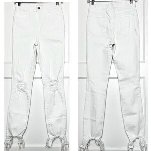 An artfully designed destructed high-rise skinny jean in crisp white. High-low tattered hem and perfectly placed distressed knees make a statement of refined modernity. An authentic denim hand is balanced by comfortable stretch and an ultra-soft feel.