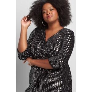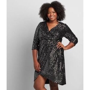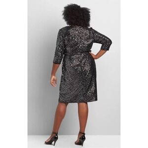 The Lane Bryant Crossover Sequin Velvet Sheath Dress in size 16 is a stylish and elegant choice for plus-size women. The dress features a flattering sheath style with a knee-length hem, perfect for a variety of occasions. The black and silver sequin accents add a touch of glamour to the velvet fabric, making it a chic and fashionable addition to any wardrobe.