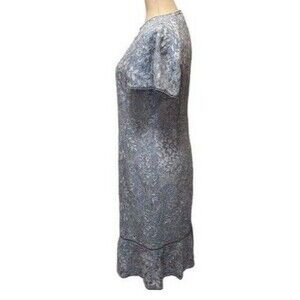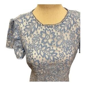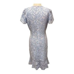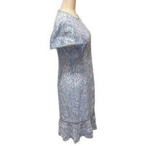 The Rachel Parcell Short Sleeve Lace Sheath Midi Dress with Ruffle Hem in a Size LARGE is a sophisticated and elegant choice for various occasions such as weddings, parties, or formal events. Made of floral lace fabric with a high waist and lined for added comfort, the dress features a ruffle hem and a crew neck with a zip closure. The blue and white color scheme adds a classic touch, while the sheath style and midi length give it a timeless and feminine appearance. Perfect for year-round wear, this dress exudes a princess-like charm and is sure to make a stylish statement.