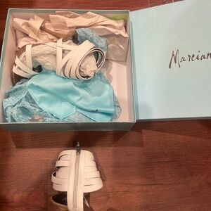 New in the box MARCIANO white high heel ankle strap sandals size 6. All leather with sleeper bag 4.5 inch heels