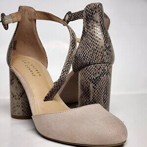 NEW LC Snakeskin Faux Suede Neutral Beige Tan Gray Chuncky Ankle Strap Heels 10