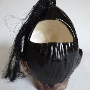 “This mug depicts the head of the shrunken head guy from the end of the 1988 film, “Beetlejuice”, where “Betelgeuse” is stuck in the after-life waiting room and antagonizes a witch doctor, who shrinks his head just like the shrunken head guy (who is wearing an explorer's outfit). It holds half a gallon (about 64 oz). The top of its head has a topknot of "hair" on it.”