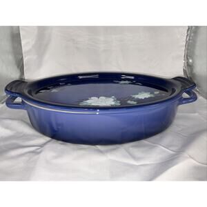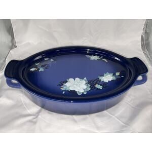 NEW LE CREUSET COBALT BLUE LOTUS OVAL CASSEROLE W/ PLATTER STONEWARE 16"