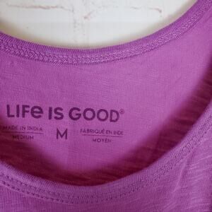 The front of the shirt has the wording "I Get My Happy Hour At the Gym" and features the words Life is Good written inside the "O"! Solid shade of purple! Gym styled tee that is a bit loose / flowy towards the bottom, with a slight scoop neckline and sleeveless. Really cute tank!