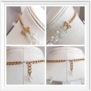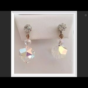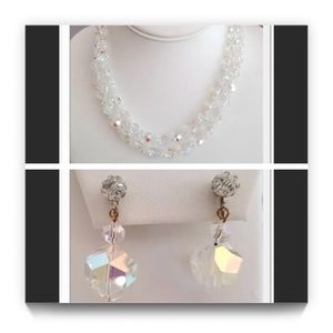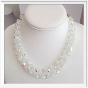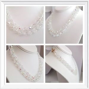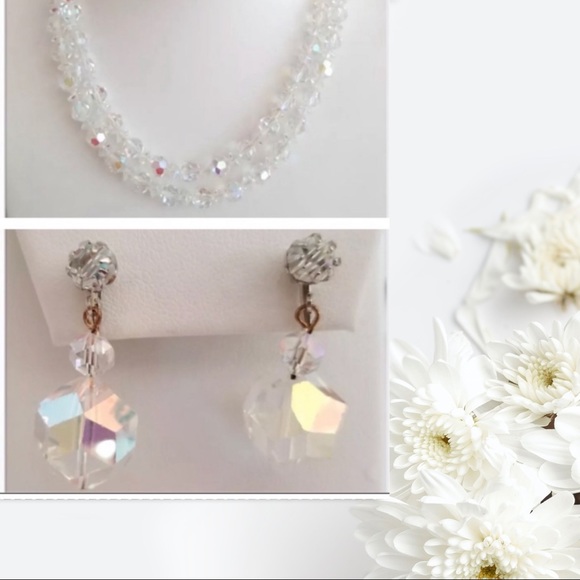 FIRM Marked down to the very lowest. This vintage necklace & Earrings would make a lovely item for a special event, especially weddings. It is made with 2 strands of 8mm glass beads with an aurora borealis finish. It has a gold tone metal Shepard’s hook clasp. It measures approximately 17’’ long and hangs another approximate 3/4’’ long from the neckline. It is unsigned. It is in excellent condition. See pictures for info on earrings or I have the earrings listed on another listing with more info