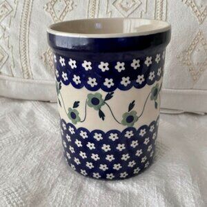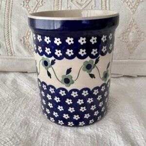 Charming ceramic Polish pottery Utensil holder with a blue, cream, and green floral pattern.