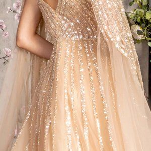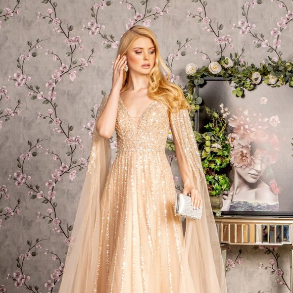 NEW LONG A-LINE MESH FOMRAL DRESS EMBROIDERED WITH SEQUINS & SIDE CAPES GL3494