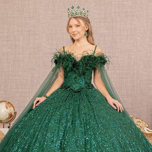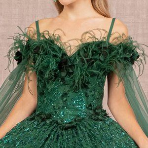 The luxurious dress made in the ball gown silhouette is decorated with delicate feathers that, together with the mesh cape, cover the forearms and floral appliques and sparkling sequins will create an eye-catching image, while the functional lacing on the back will ensure a reliable fixation of the dress.