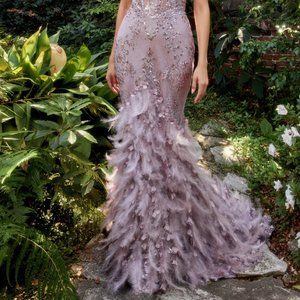 The glamorous dress made in the mermaid silhouette is completely covered with exquisite lace and sparkling sequins, which together with the feathers on the skirt create a unique image, while the functional lacing on the back will ensure a reliable fixation of the dress.