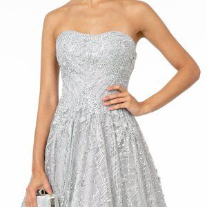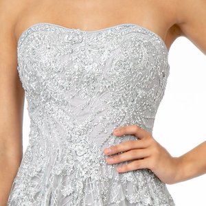 The charming dress made in a-line silhouette has a structural top decorated with exquisite lace and rhinestones as well as the entire perimeter of the dress, while an inconspicuous zipper on the back will ensure a secure fixation of the dress on your special evening.