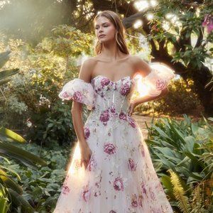 The magical dress made of layered organza fabric it features a delightful floral print in the form of peonies, which together with a small number of rhinestones create a bright image. Removable puff sleeves will add the ability to change the image in one minute and an inconspicuous zipper on the back will ensure a secure fixation of the dress.