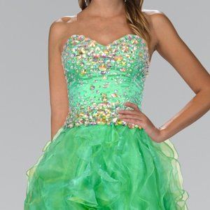 The charming dress made in the silhouette of ball gown has a structured top decorated with sparkling rhinestones, which together with a high-low ruffled skirt create a glamorous image, while functional lacing on the back will ensure a secure fixation of the dress.