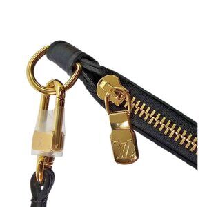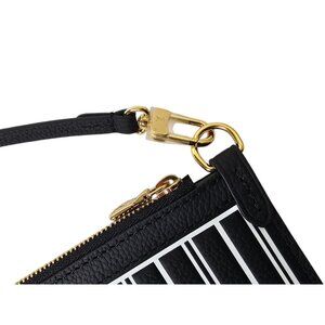 Crafted in smooth black calfskin leather with contrasting white line detailing, this pochette was designed as a companion piece to Louis Vuitton’s reimagined reversible Neverfull from the Inside Out Collection. The sleek design is finished with polished gold hardware and a secure top zipper.