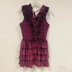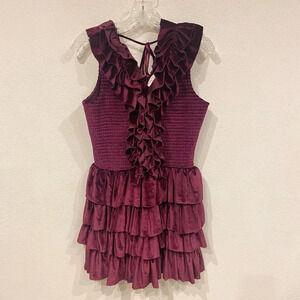 Dress with ruffle detailing throughout and velvet materials. Features mini length and self tie at back.