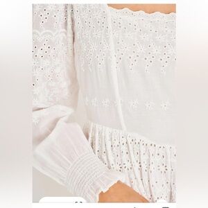 Beautiful slip lined cotton eyelet babydoll dress by LoveShackFancy. Hides side zipper, puffed shoulders and smocked wrists are all extra quality details. Slip has hidden snaps to keep in place with dress. Home removal tag still attached, easy to remove at home, protects us both.
