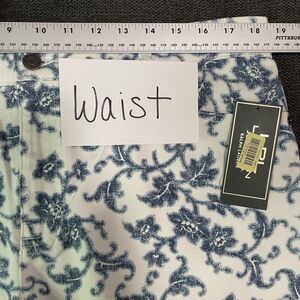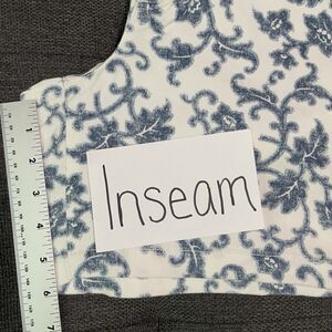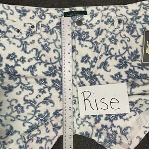 New with tags, these women's size 14 shorts from Lauren Jeans Co. by Ralph Lauren are a vintage piece likely from the early 2000s. They feature a beautifully detailed blue floral and vine print set against a crisp white background, offering a charming, feminine look that stands out from more modern designs. Crafted from a soft yet structured cotton and elastane blend, they provide a comfortable fit with just a touch of stretch. Classic five-pocket styling, a zip fly with button closure, and belt loops complete the timeless silhouette. These shorts are in excellent, unworn condition with the original tags still attached — a rare find for vintage Ralph Lauren. Please refer to photos for exact measurements.