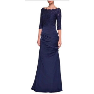 NEW La Femme 24926 Lace and Jersey Trumpet Gown Dress Navy Size 6