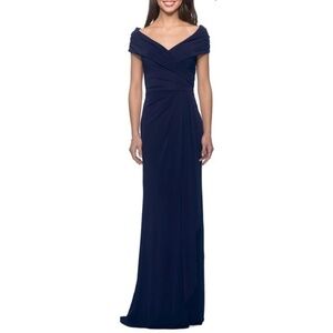 NEW La Femme 26519 Off Shoulder Draped Ruched Floor Length Gown in Navy