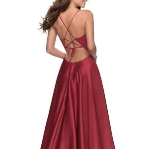 NEW La Femme 28628 Full Skirt Deep V Neckline Strappy Back Gown in Deep Red 0